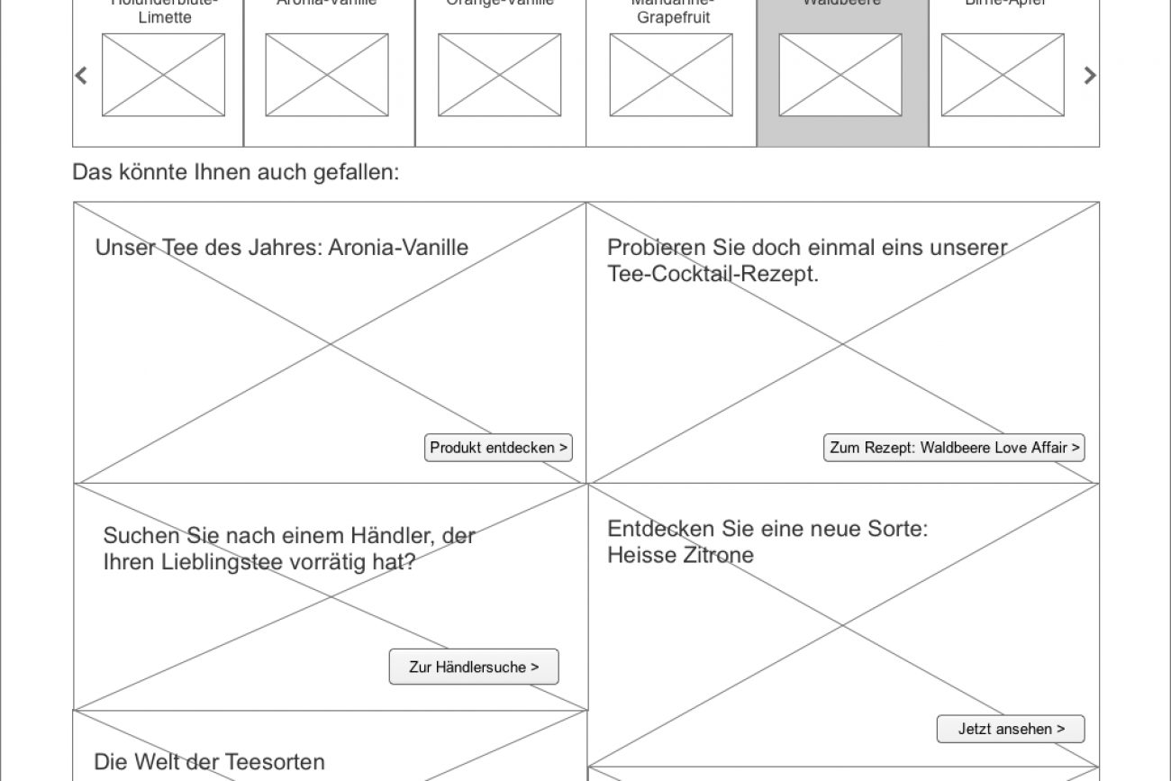 Auch in diesem Projekt habe ich die Wireframes so gut wie komplett betextet, damit sie nicht nur verständlicher für den Kunden sind, sondern ihm auch einen ersten Text-Vorschlag als Arbeitsgrundlage liefern.